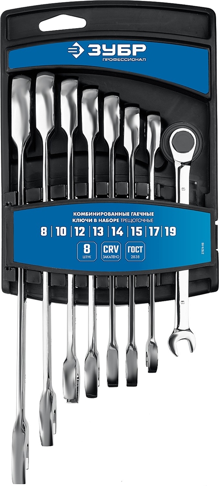 ЗУБР 8 шт, 8 - 19 мм, набор комбинированных трещоточных гаечных ключей, Профессионал (27074-H8)