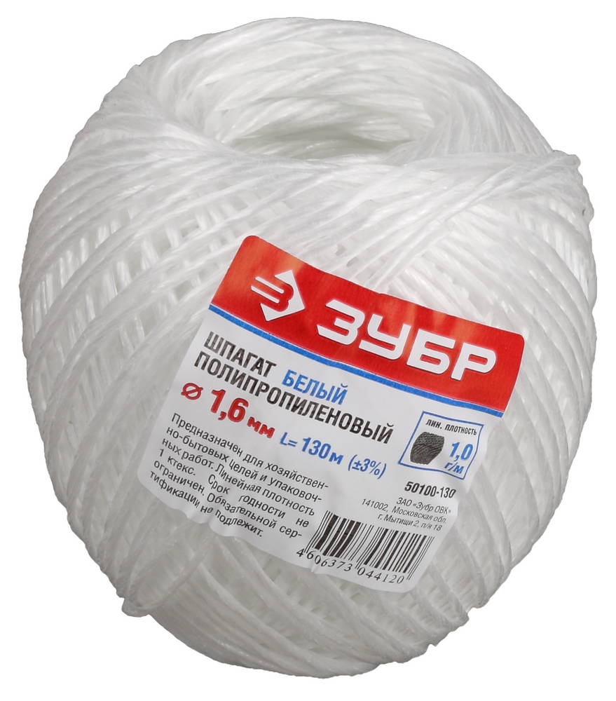 ЗУБР d 1.6 мм, 130 м, 1600 текс, 22 кгс, белый, полипропиленовый шпагат (50100-130) сертифицирован производителем ЗУБР, передача сертификатов осуществляется в момент отгрузки товара после обращения покупателя.