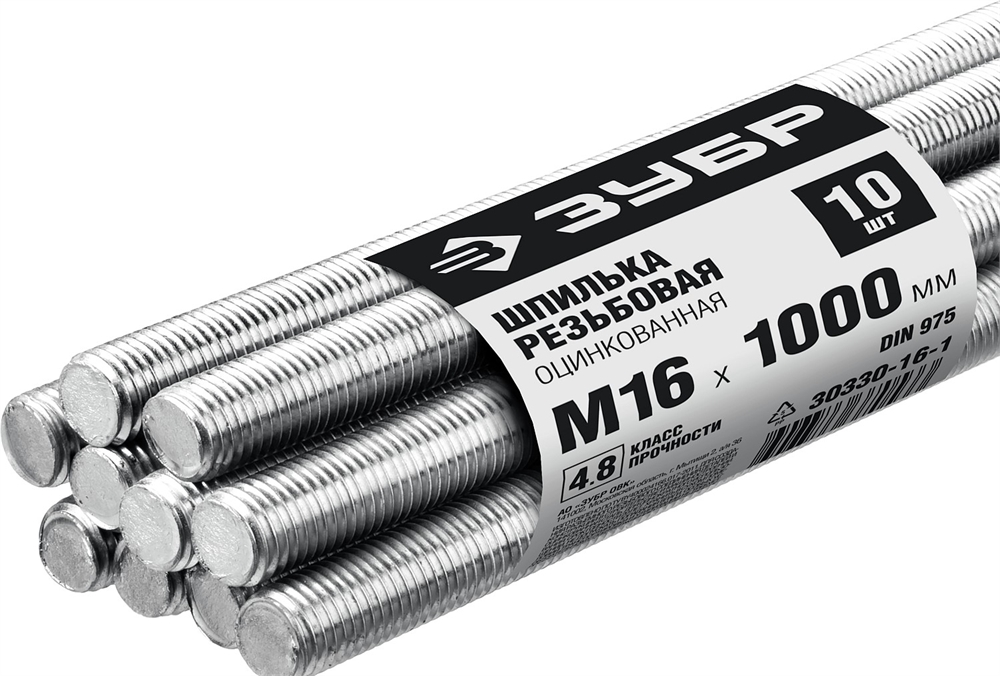 ЗУБР DIN 975, кл. пр. 4.8, М16 х 1000 мм, цинк, 10 шт, резьбовая шпилька (30330-16-1)