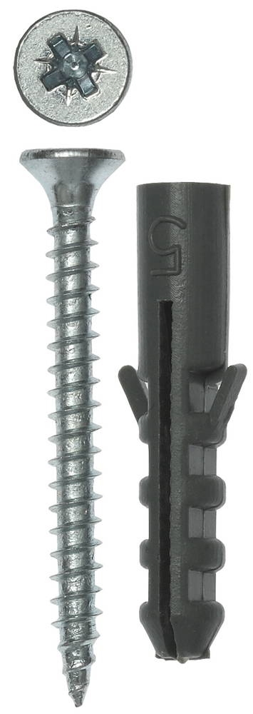 Для монтажа элементов и конструкций к полнотелым строительным материалам (бетон, кирпич, природный камень). Фиксация дюбеля происходит при вкручивании в него самореза (входит в комплект поставки). Диаметр предварительного сверления: 5 мм.