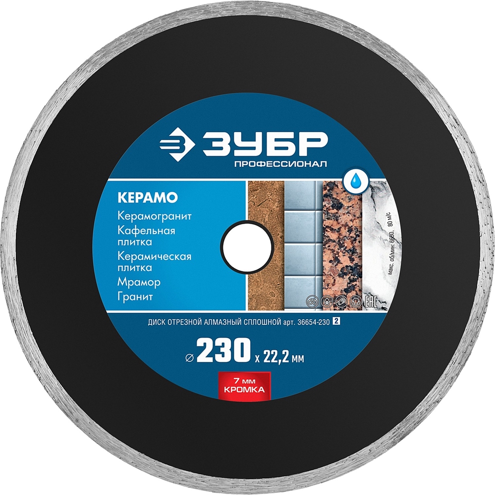 ЗУБР Керамо-22, d 230 мм, (22.2 мм, 7 х 2.4 мм), сплошной алмазный диск, Профессионал (36654-230)