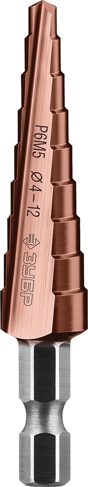 ЗУБР Кобальт, 4-12 мм, 9 ступеней, сталь Р6М5, кобальтовое покрытие, ступенчатое сверло, Профессионал (29672-4-12-9)