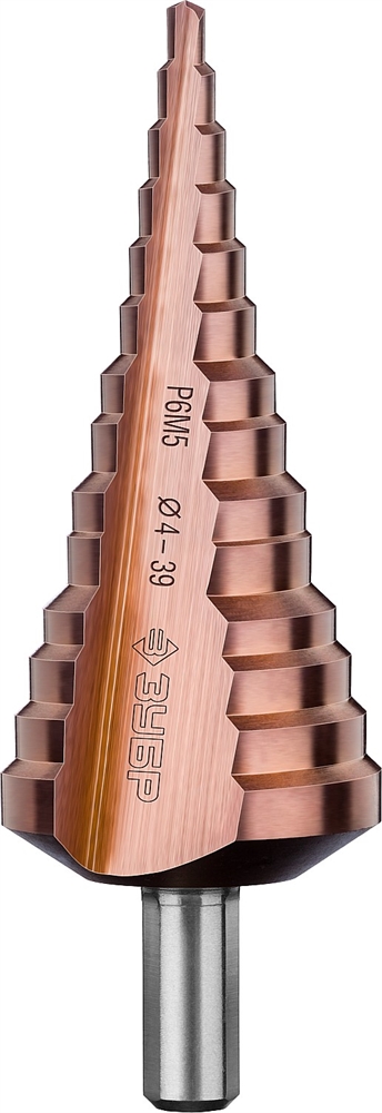 ЗУБР Кобальт, 4-39 мм, 14 ступеней, сталь Р6М5, кобальтовое покрытие, ступенчатое сверло, Профессионал (29672-4-39-14)