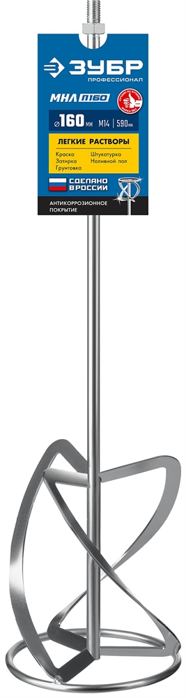 ЗУБР М14, d160 мм, насадка-миксер для легких растворов ″сверху-вниз″, Профессионал (МНЛ-П160) сертифицирован производителем ЗУБР, передача сертификатов осуществляется в момент отгрузки товара после обращения покупателя.