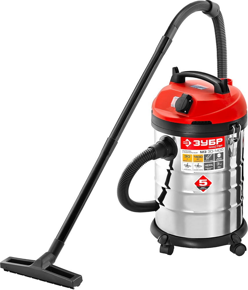 Строительный пылесос ЗУБР предназначен для уборки помещений, а также для принудительного удаления продуктов пиления, строгания, фрезерования и т.п. из рабочей зоны электроинструмента. Он незаменим для поддержания чистоты в гараже, мастерской, удаления мусора во время ремонта в квартире или на даче. Бак из нержавеющей стали объемом 30 л очень долговечен. а синхронное включение с инструментом, подключенным через розетку пылесоса позволит сохранить чистоту на рабочем месте.