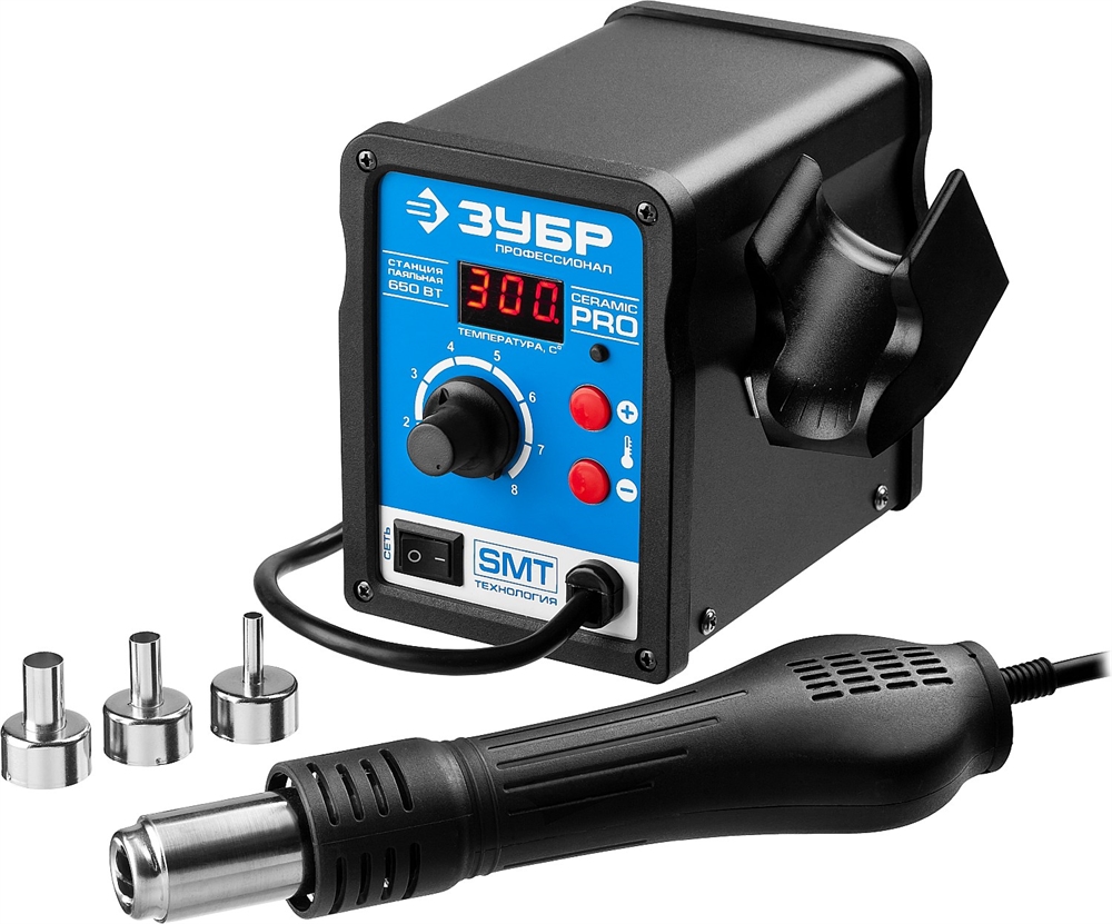 ЗУБР ПСТ-650, 650 Вт, 100 - 500°C,120 л/мин, 3 насадки, керамический нагреватель, цифровая термовоздушная паяльная станция, Профессионал (55350)