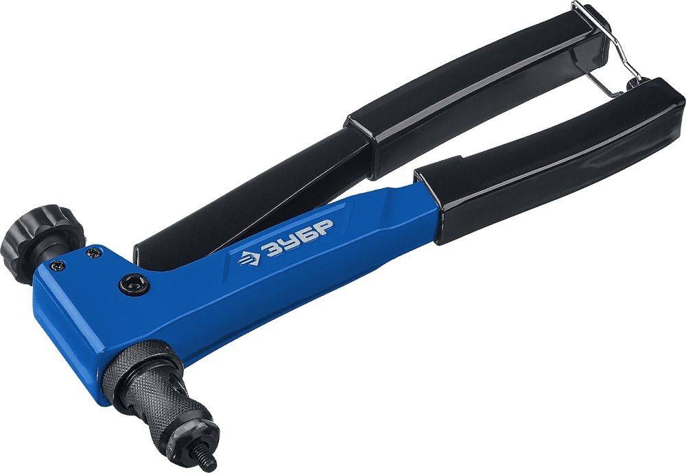 Применяется для установки стальных и алюминиевых резьбовых заклепок. Способ применения 1. Разожмите рукоятки и установите насадку и резьбовой стержень требуемого диаметра. Для замены резьбового стержня необходимо вытолкнуть штифт через боковое отверстие в головке. 2. Накрутите заклепку на стержень до упора, рукоятки при этом должны быть полностью разжаты. При необходимости ослабьте гайку и отрегулируйте ход вращением корпуса головки. 3. Вставьте заклепку в отверстие и сожмите рукоятки. 4. Выкрутите стержень из заклепки, вращая рукоять против часовой стрелки. Заклепка установлена, когда образовался бортик. Дальнейшее вытягивание приводит к поломке насадок.