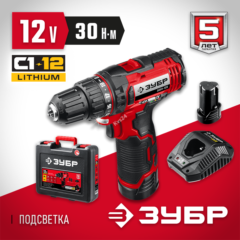 ЗУБР С1-12, 12 В, 30 Н·м, 2 АКБ (2 А·ч), дрель-шуруповерт, кейс (ДШЛ-125-22)