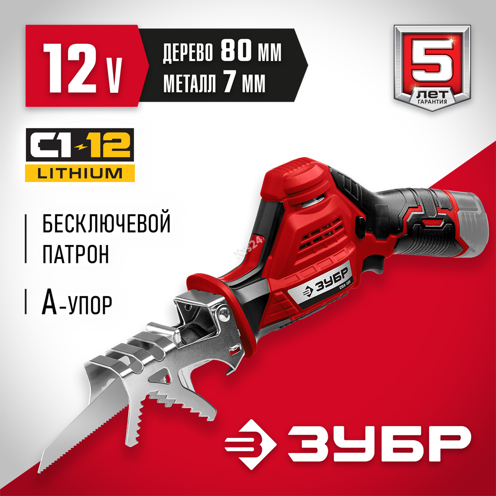 ЗУБР С1-12, 12 В, 80 мм, без АКБ, сабельная пила (СПЛ-125)