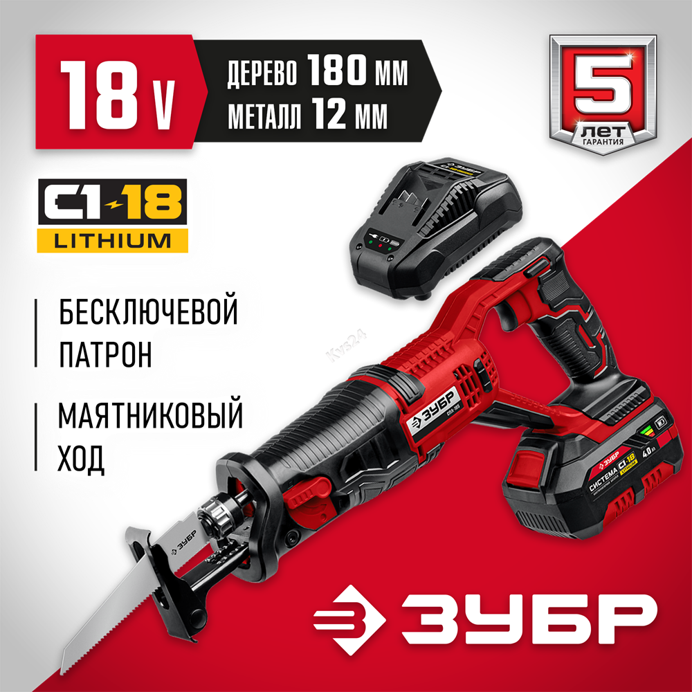 ЗУБР С1-18, 18 В, 180 мм, 1 АКБ (4 А·ч), сабельная пила (СПЛ-185-41)