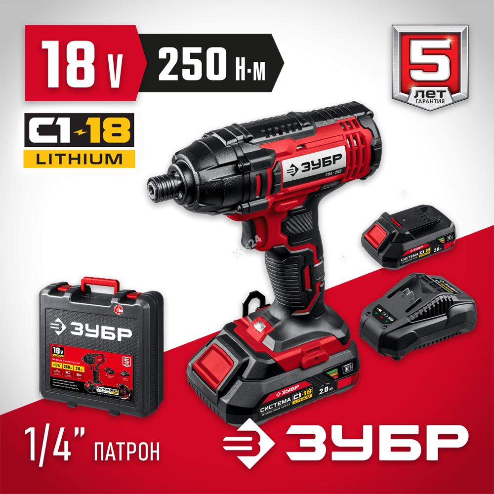 ЗУБР С1-18, 18 В, 250 Н·м, 2 АКБ (2 А·ч), винтоверт ударный, кейс (ГВЛ-255-22) сертифицирован производителем ЗУБР, передача сертификатов осуществляется в момент отгрузки товара после обращения покупателя.