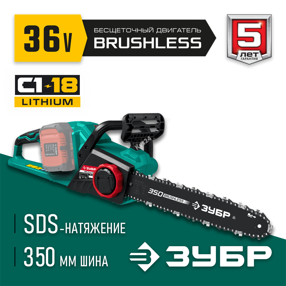 ЗУБР С1-18, 36 В, 35 см шина, без АКБ, бесщеточная цепная пила (ПЦЛ-3635)