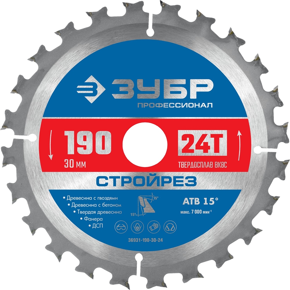 ЗУБР Стройрез, 190 х 30 мм, 24Т, пильный диск по строительной древесине, Профессионал (36931-190-30-24)