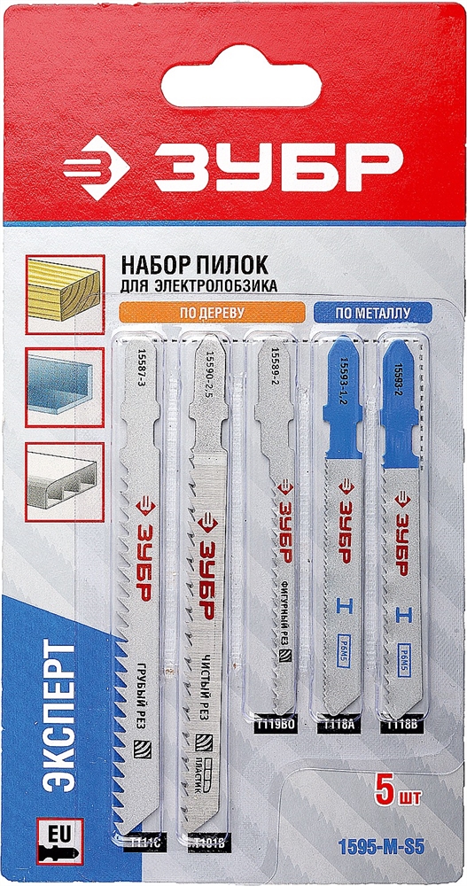 ЗУБР T-хвост., по дереву и металлу, 5 шт, набор полотен для лобзика (1595-M-S5) сертифицирован производителем ЗУБР, передача сертификатов осуществляется в момент отгрузки товара после обращения покупателя.