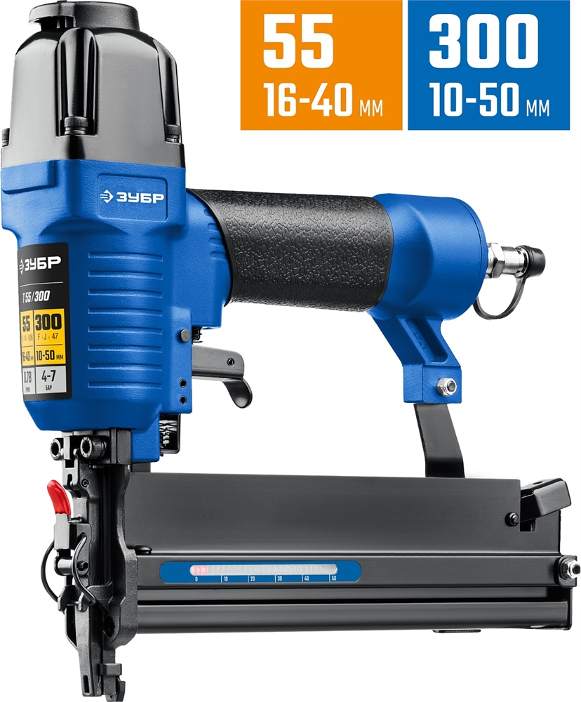 ЗУБР Т55/300, пневматический нейлер-степлер 18Ga 2-в-1: для скоб тип 55 (16-40мм) и гвоздей тип 300 (10-50 мм), Профессионал (31937)