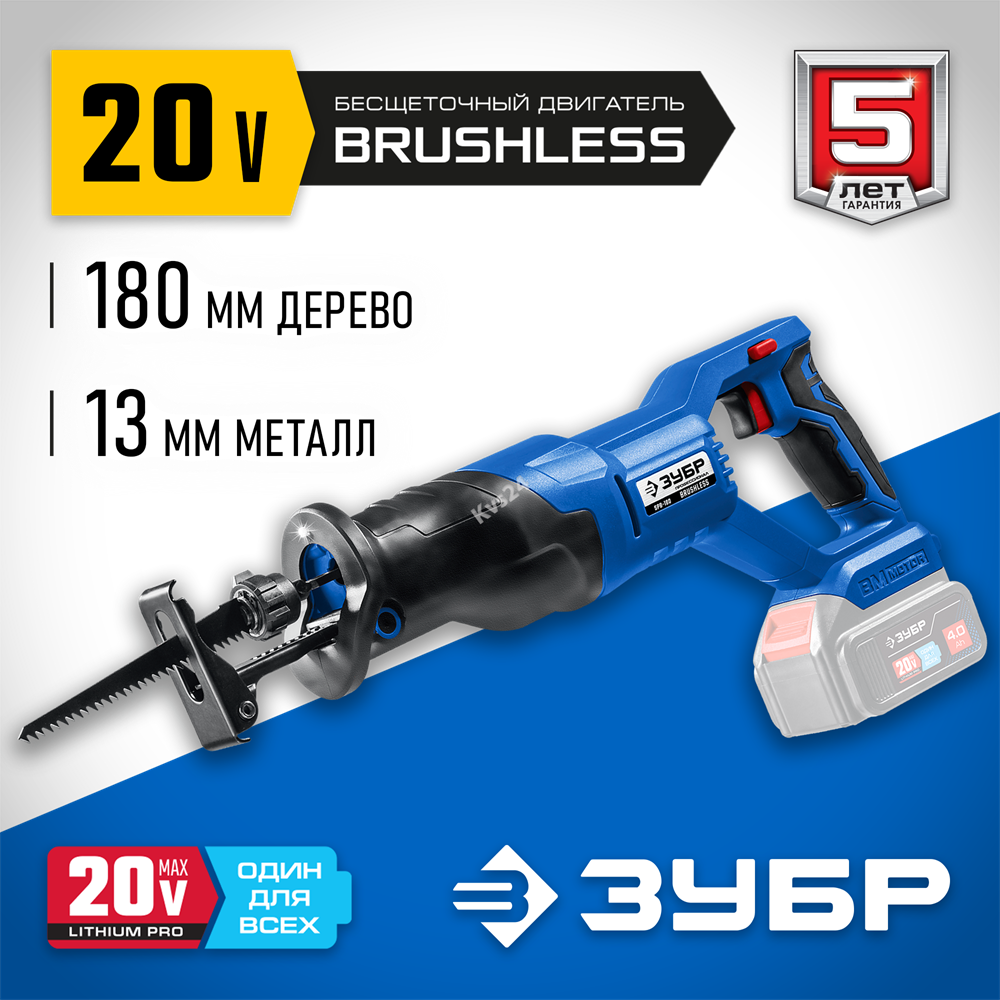 ЗУБР Т7, 20 В, 180 мм, без АКБ, бесщеточная пила сабельная, Профессионал (SPB-180)