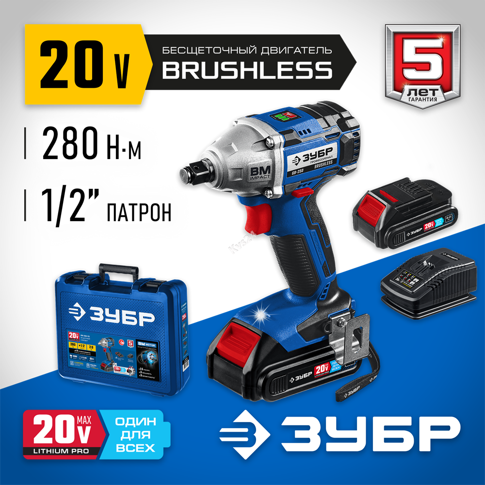 ЗУБР Т7, 20 В, 280 Н·м, 2 АКБ (2 А·ч), бесщеточный гайковерт, кейс, Профессионал (GB-250-22)