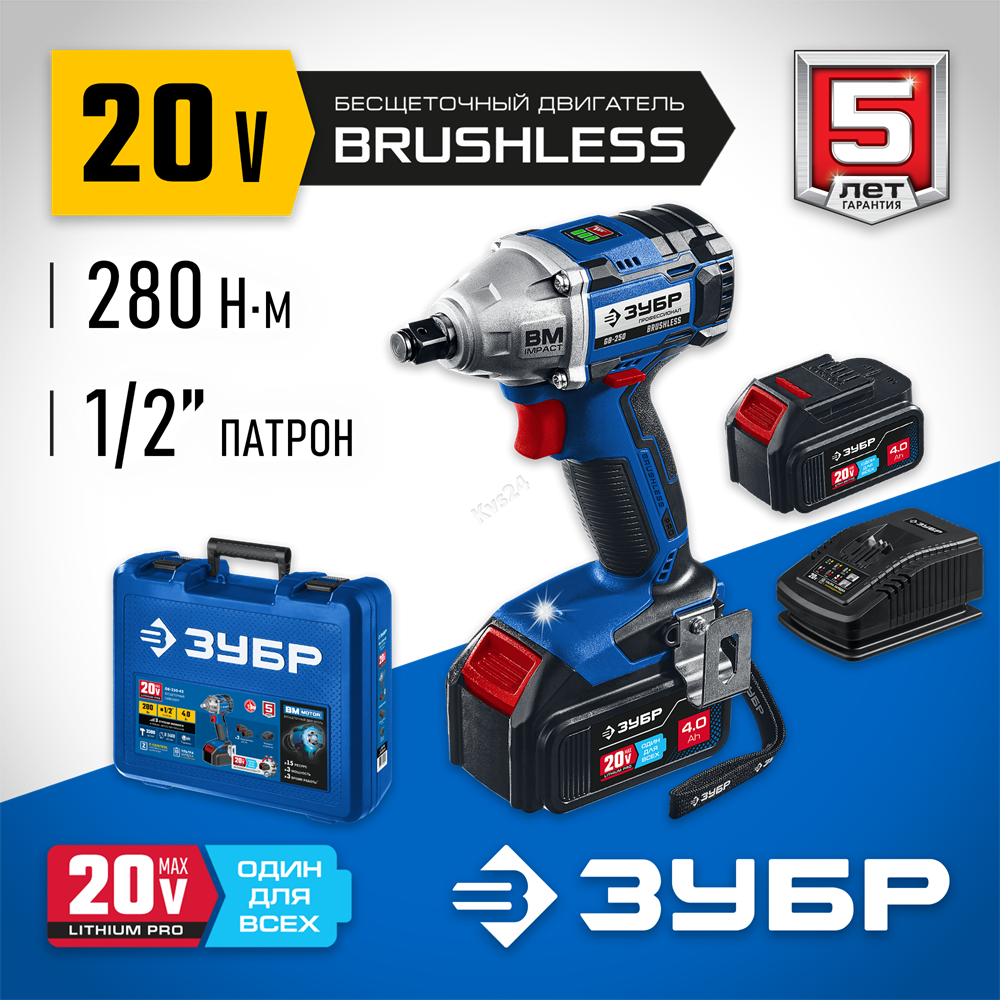 ЗУБР Т7, 20 В, 280 Н·м, 2 АКБ (4 А·ч), бесщеточный гайковерт, кейс, Профессионал (GB-250-42)