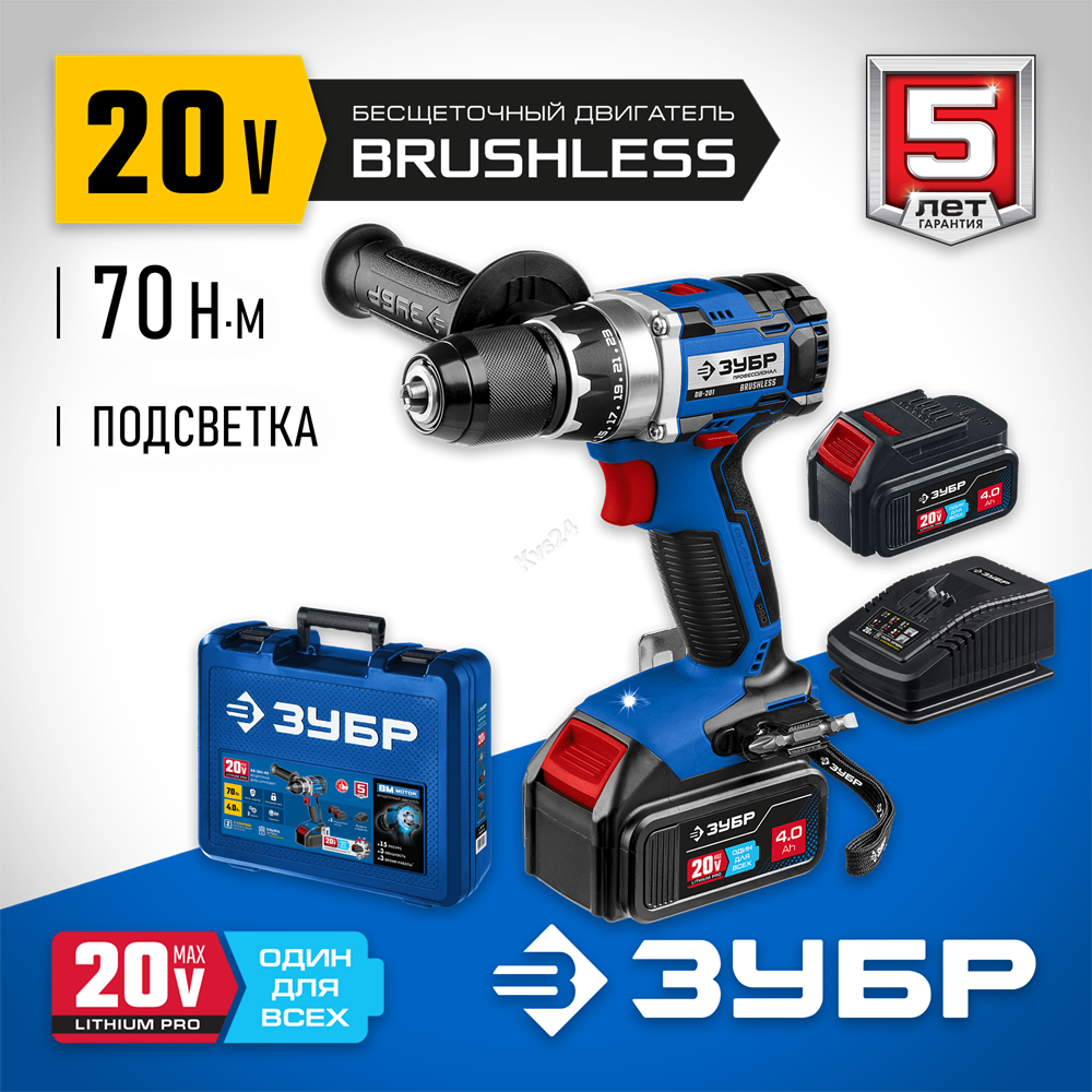 ЗУБР Т7, 20 В, 70 Н·м, 2 АКБ (4 А·ч), бесщеточная дрель-шуруповерт, кейс, Профессионал (DB-201-42)