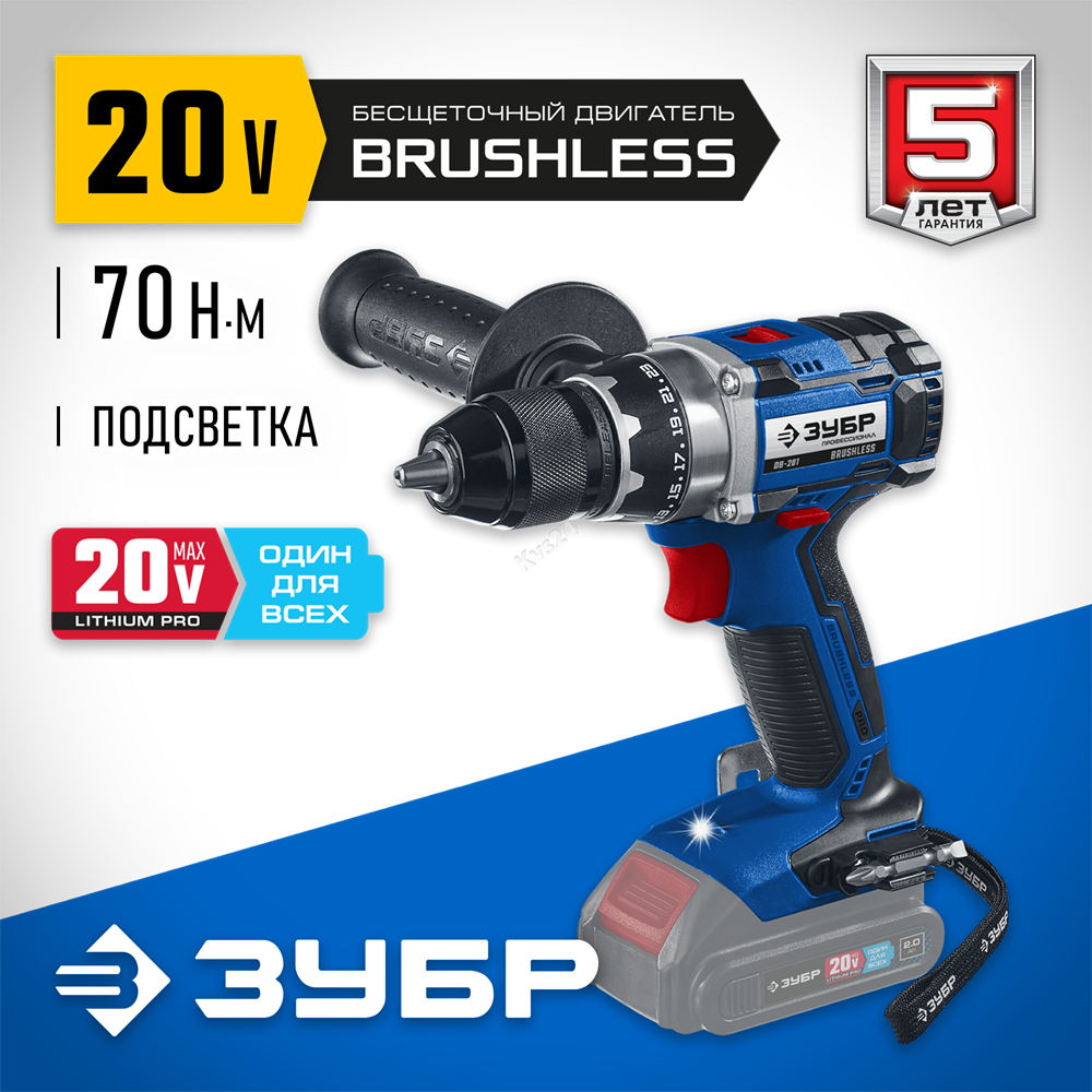 ЗУБР Т7, 20 В, 70 Н·м, без АКБ, бесщеточная дрель-шуруповерт, Профессионал (DB-201)