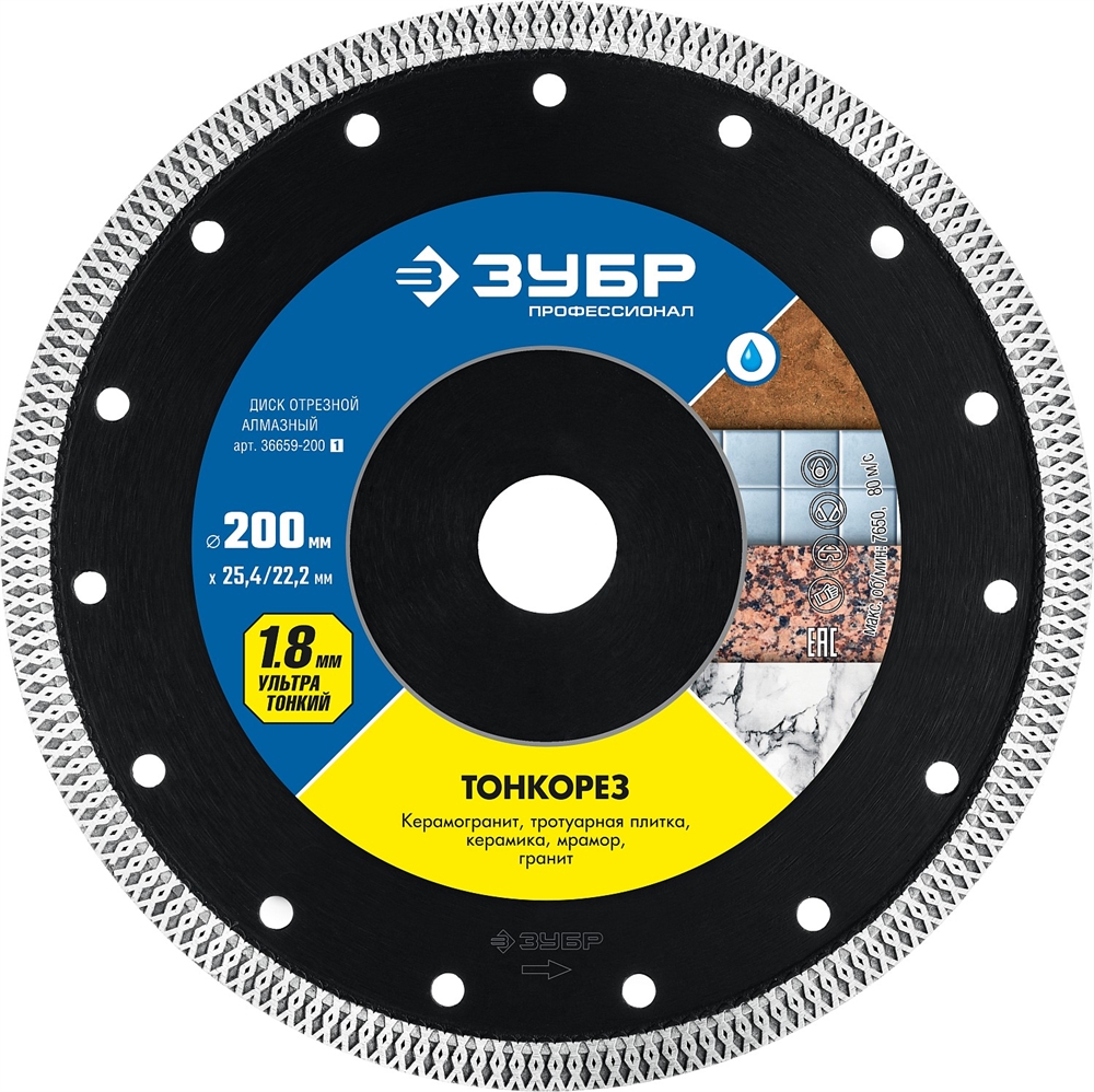 ЗУБР Тонкорез, 200 мм, (25.4/22.2 мм, 10 х 1.8 мм), ультратонкий алмазный диск (36659-200) сертифицирован производителем ЗУБР, передача сертификатов осуществляется в момент отгрузки товара после обращения покупателя.