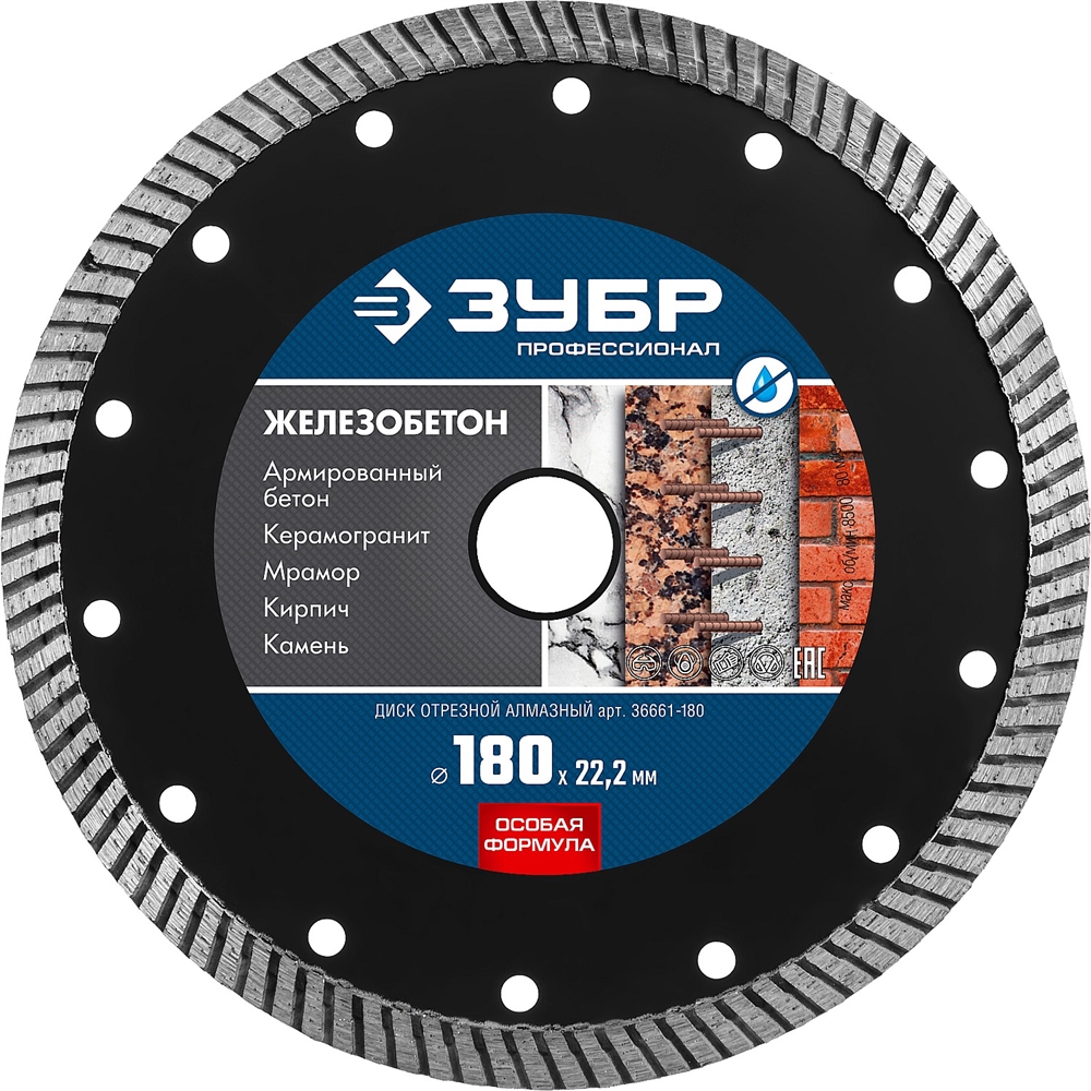 ЗУБР Железобетон, 180 мм, (22.2 мм, 10 х 2.6 мм), сегментированный алмазный диск, Профессионал (36661-180) сертифицирован производителем ЗУБР, передача сертификатов осуществляется в момент отгрузки товара после обращения покупателя.