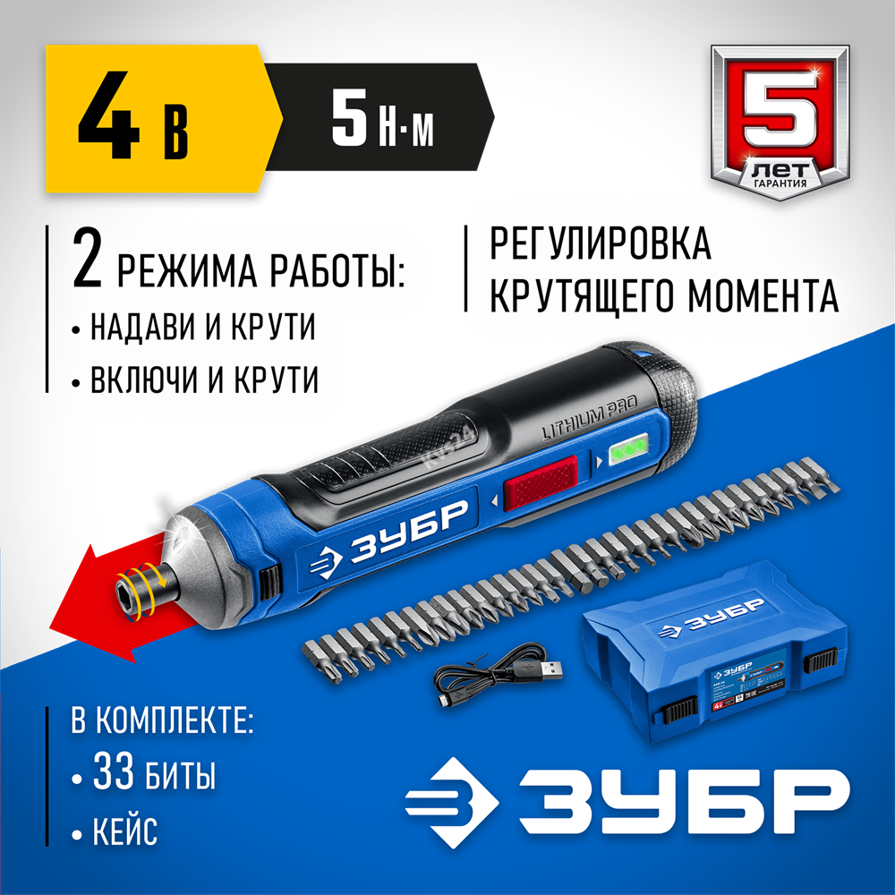 ЗУБР ZUBR GO 4 Vmax, аккумуляторная отвертка, кейс, 33 биты, Профессионал (PSD-4S)